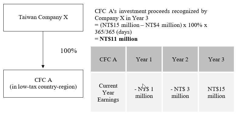 For instance, Taiwan Company X has held 100% of Company A (Taiwan Company X's CFC located in a low-tax country) for three years, and the assessed losses of the CFC in the first and second years were NT$1 million and NT$3 million, respectively, and the CFC's earnings for the third year is NT$15 million. In calculating the third year's taxable income, Taiwan Company X should use the CFC's current year earnings of NT$15 million and deduct the assess losses of NT$1 million and NT$3 million, respectively, from the CFC's current year earnings, and then recognize the investment proceeds of NT$11 million based on its shareholding percentage of 100% and include it in its current year's taxable income.