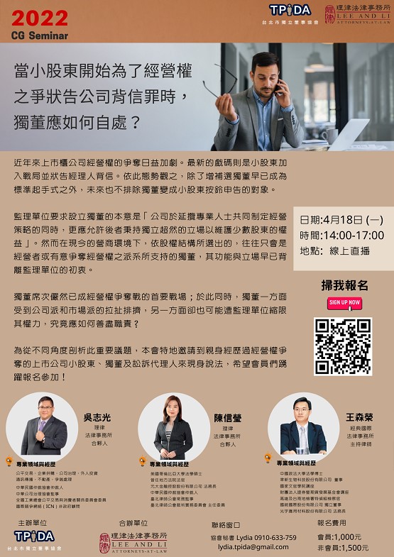 台北市獨立董事協會秘書 Lydia 0910-633-759 Email: lydia.tpida@gmail.com
