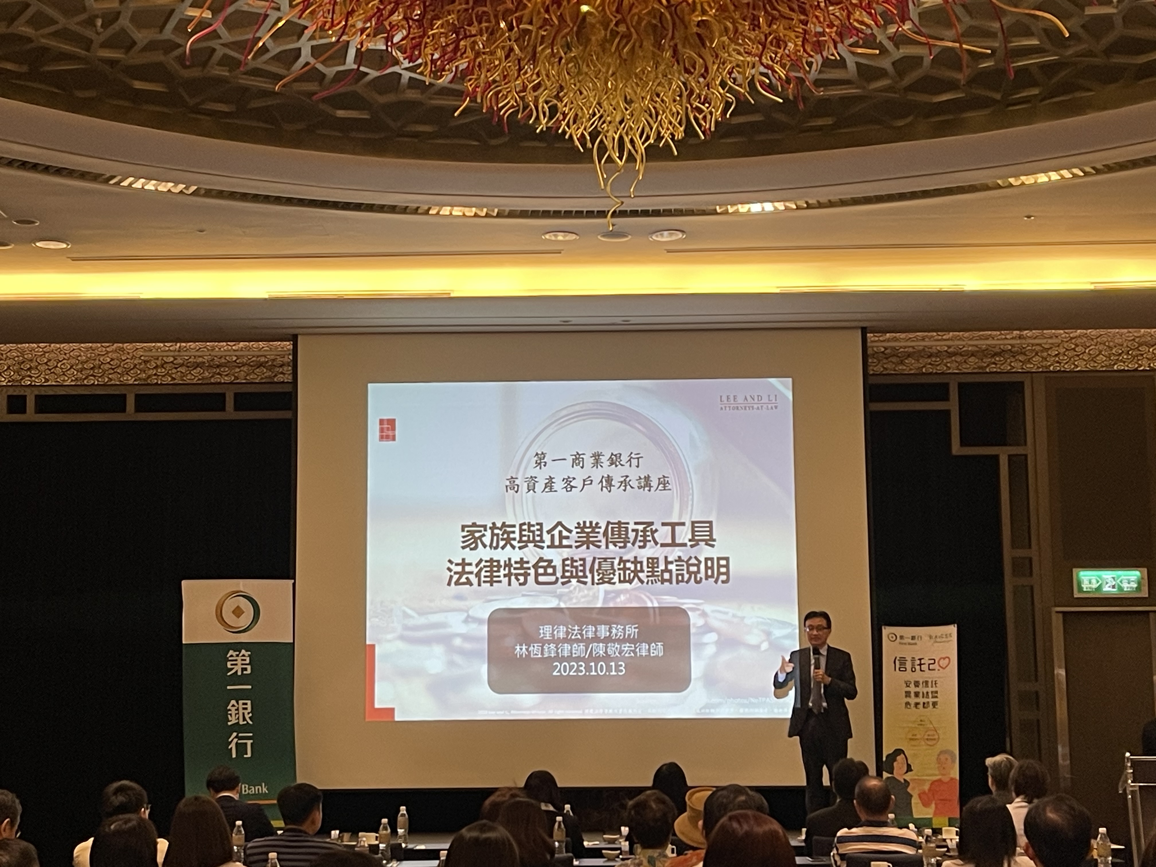 理律與第一銀行共同於台北喜來登酒店及台中林酒店主辦「傳承信託研討會」,由林恆鋒合夥律師及陳敬宏初級合夥律師以實務經驗分享各種家族傳承工具的特色與優缺點,深入淺出,使與會來賓輕鬆了解包括信託在內傳承工具之特有功能,有助選擇最適合自己家族的傳承方式。